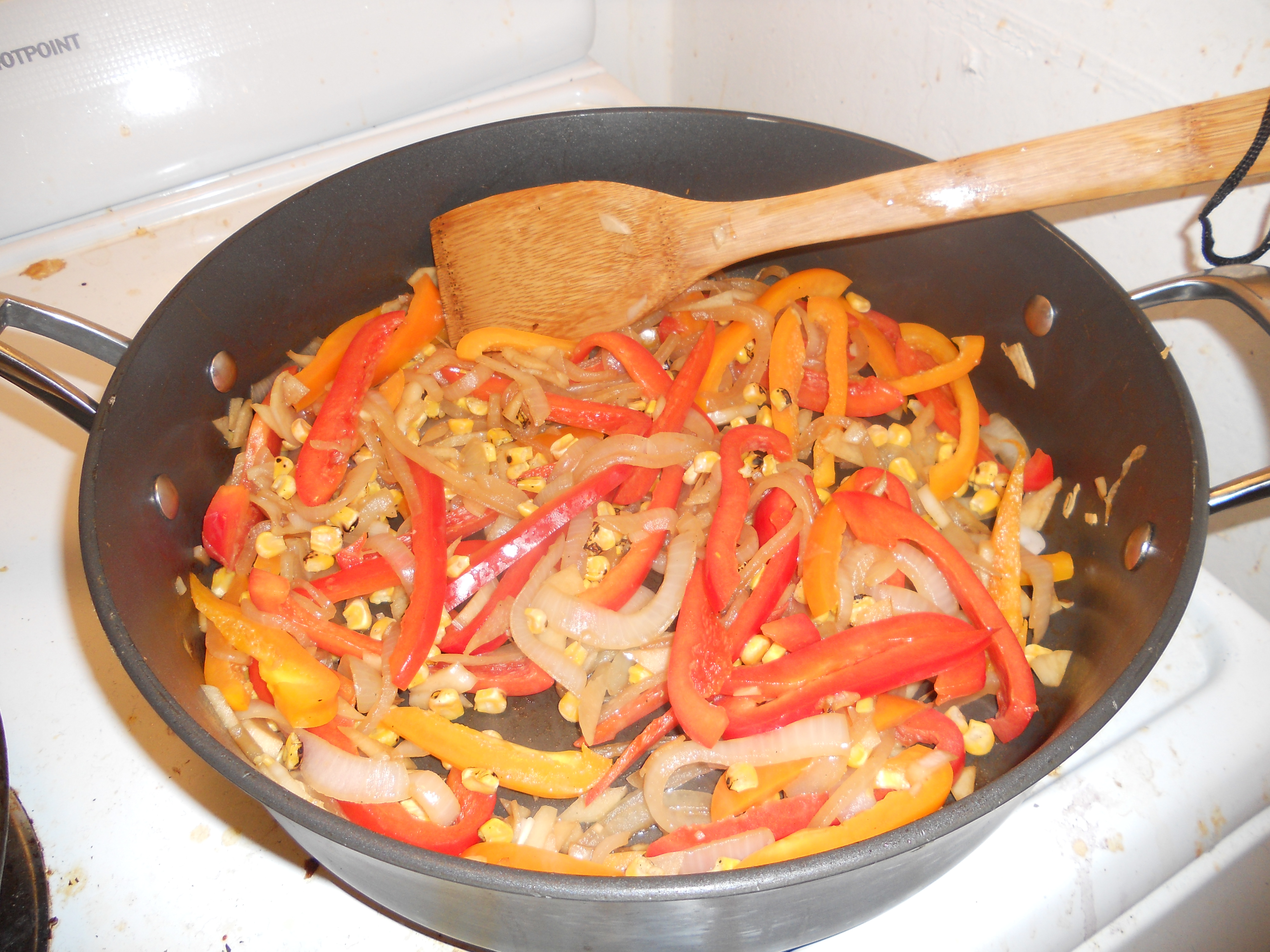 Saute onions, garlic, peppers, and some frozen roasted corn from Trader Joe’s (yum!)