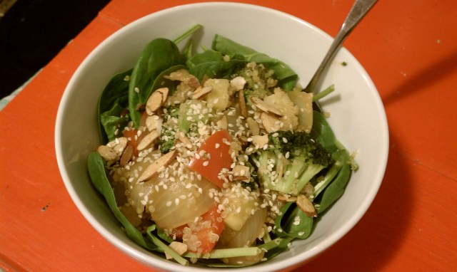 • Right before the veggies are fully cooked add chopped up pieces of pineapple and the cooked quinoa