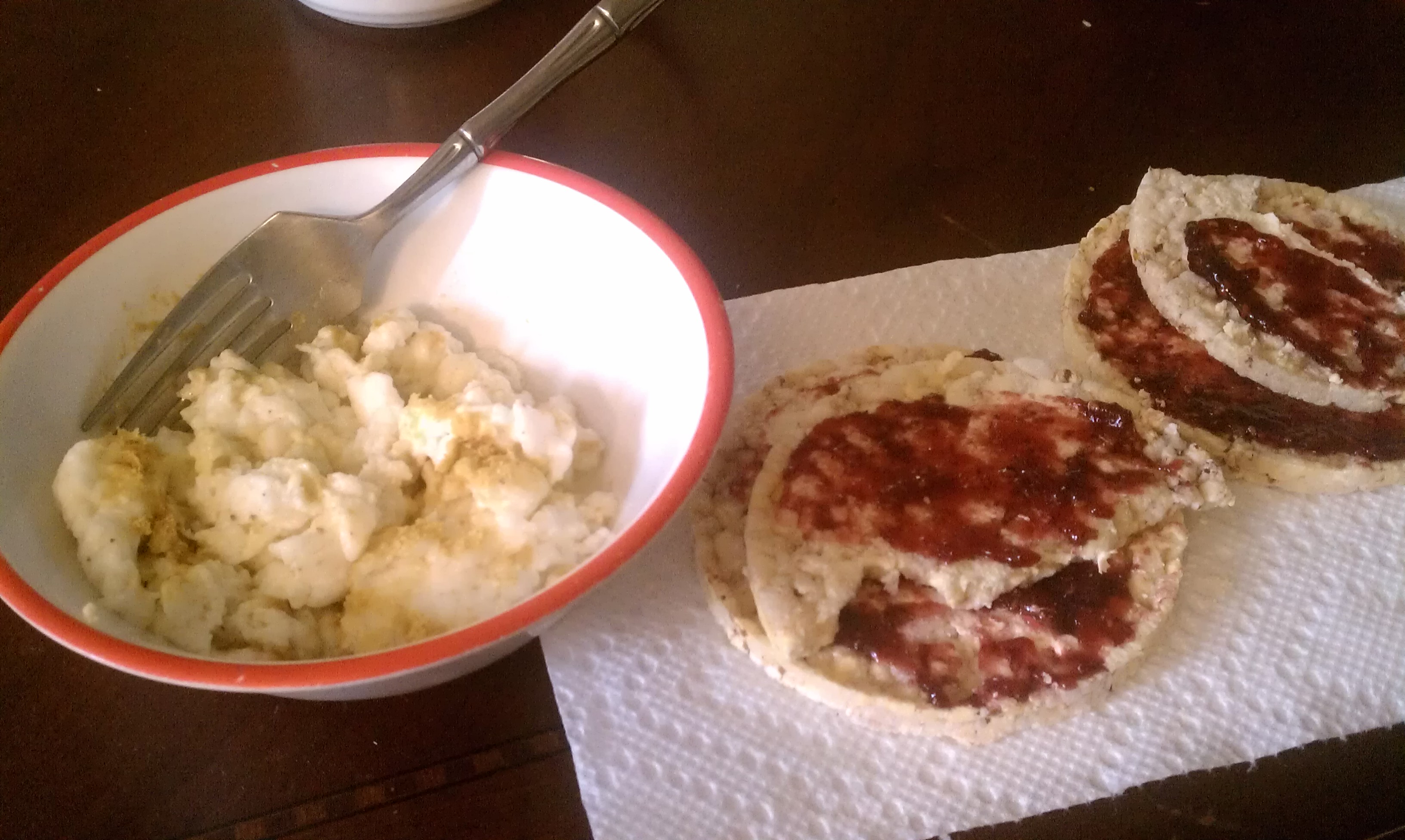 Ever wake up with a craving? Well I had to have eggs yesterday morning so eggs I had, complete with nutritional yeast and a few rice cakes with jam.