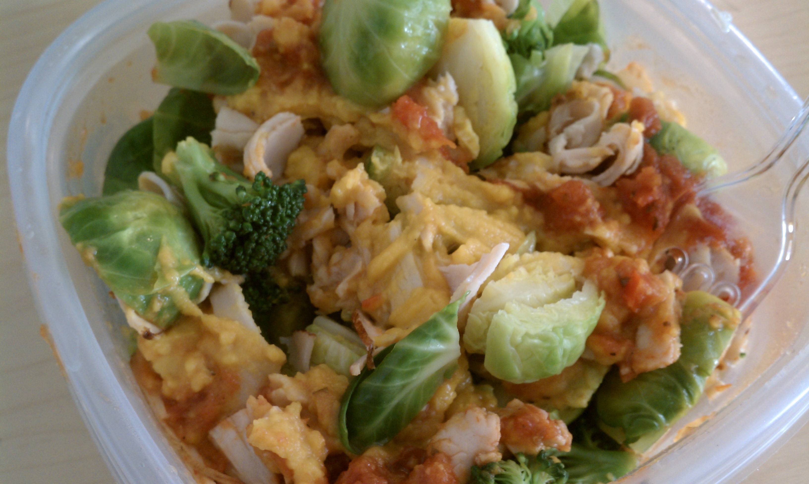 Lunch was leftover broccoli, brussel sprouts, turkey and bit of the “cheese sauce” I made last week with some pasta sauce as well. Sounds a bit odd but heated up it was quite satisfying as a mid-day meal.