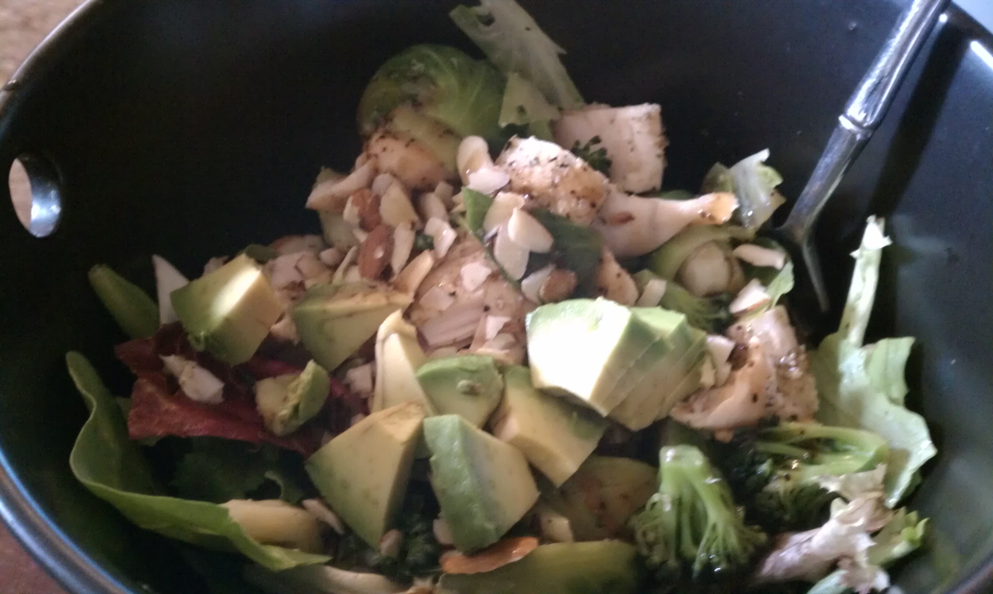 While I am not the St. Patrick’s Day celebrating type I did follow the green theme for lunch too: left over chicken, almond slivers, avocado, brussel sprouts and broccoli.