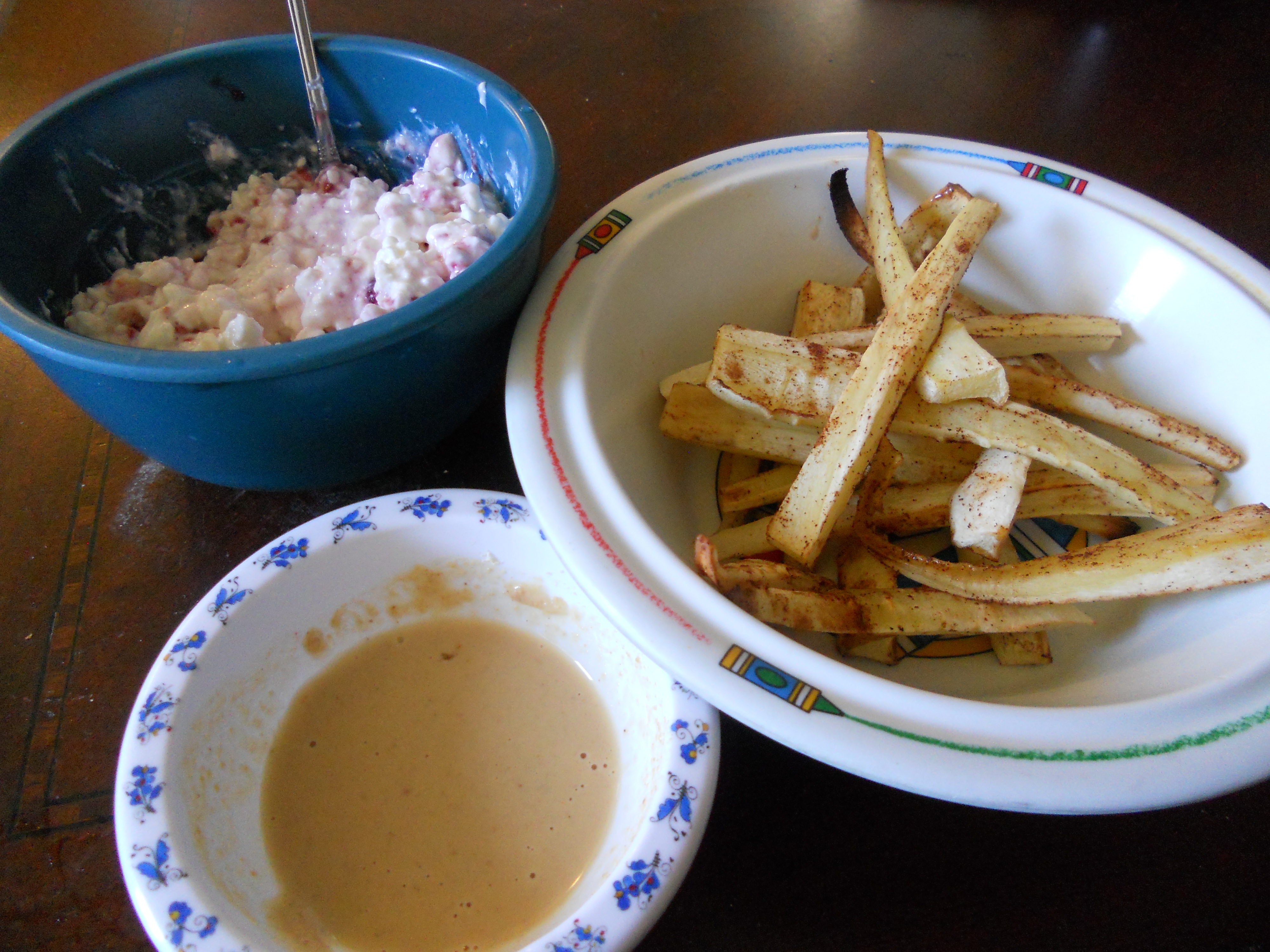 Needless to say I was hungry for lunch after I survived the class and whipped up some parsnip and rutabaga fries with some cinnamon and maple syrup. I also made a PB2 dipping sauce and rounded out the meal with a bowl of cottage cheese and jam.