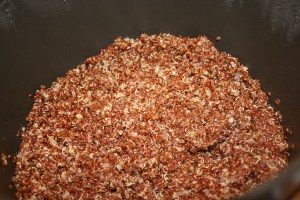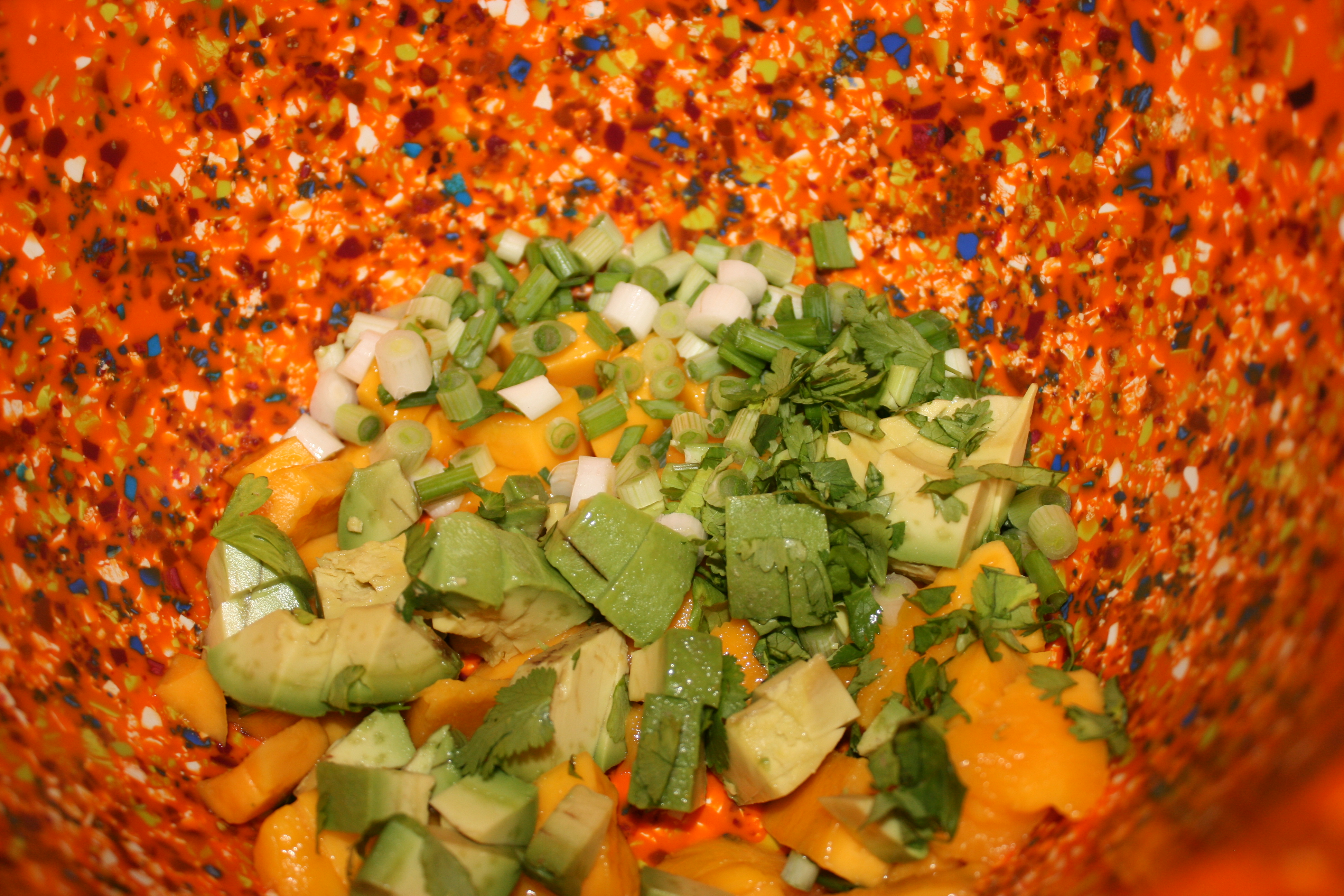 Quinoa prepared with chicken stock and garlic, combined with avocado, mango, green onions, almond slivers, spinach, splash of lime and some asian dressing. The combination was divine!