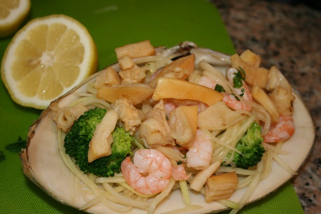 To prepare the salad simply grate/shred one green papaya and steam any veggies that you would like (I used broccoli). For the shrimp, defrost and cook in a pan with a squeeze of lime and a large splash of tequila. Stir all of the ingredients together with the sauce: