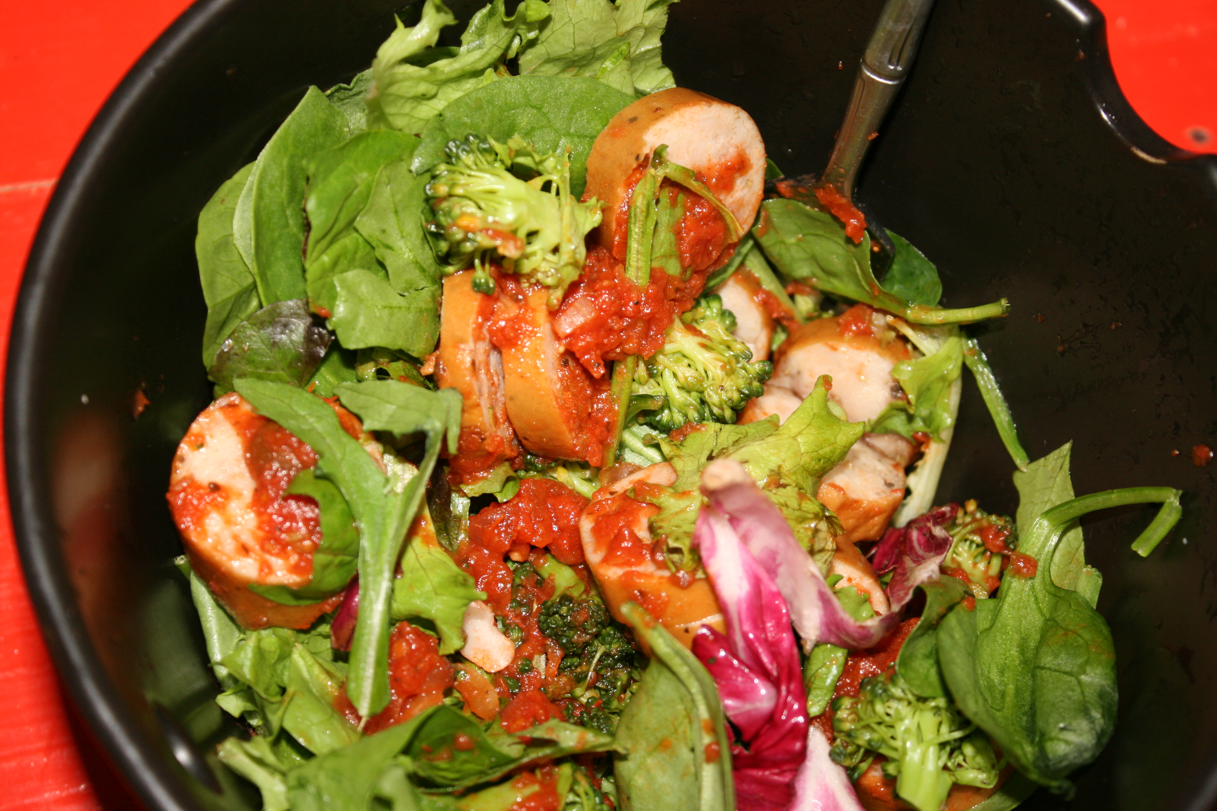 Instead of a involving myself in an elaborate chopping, stirring and cooking process, I heated up a pre-cooked chicken sausage with some broccoli, greens and tomato sauce.