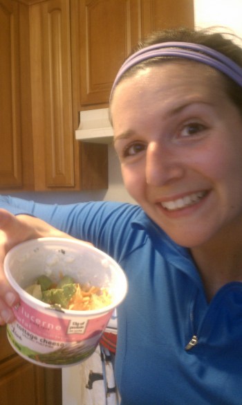 What does someone look like after a 10 1/2 hour work day full of meetings and a last minute project, a long bus ride home, a quick wardrobe change, a hilly 3 mile run and an 8 o’clock cottage cheese dinner?