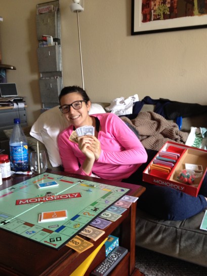 Well I really do have a “Lazy Bum” so to speak – with a foot-long incision on my left bum to fix my hip I’m not in any rush to be active. But Sunday was a cloudy, cool day in San Francisco, nothing like the rest of the country’s heatwave weather, so Dave and I decided to play a foul weather board game: Monopoly!