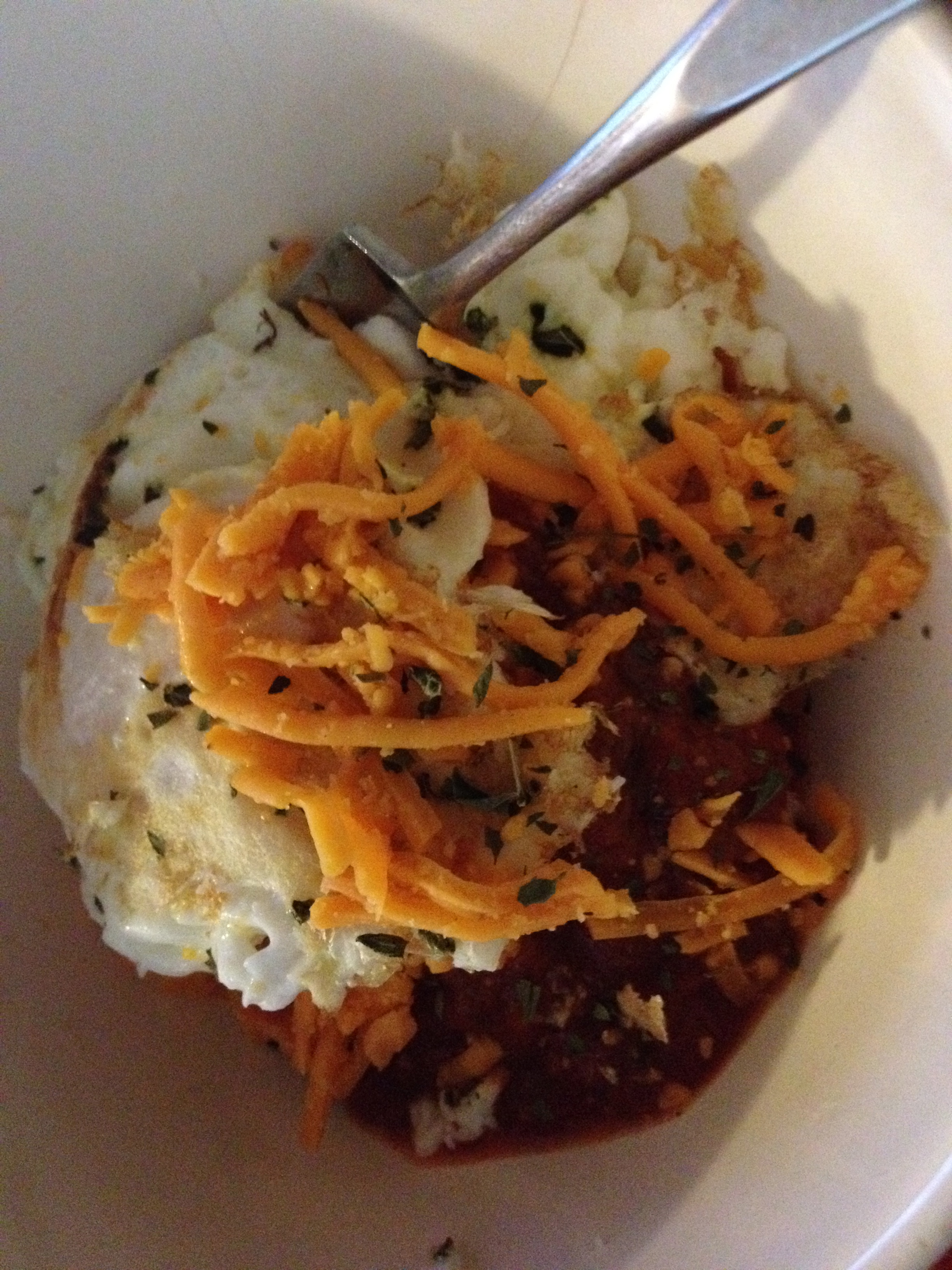 Obviously this in no way resembled the taste of actual pizza but it was nice to have a more savory breakfast for a change. I simply mixed my eggs with garlic and oregano and then topped them with tomato sauce and cheddar almond cheese.