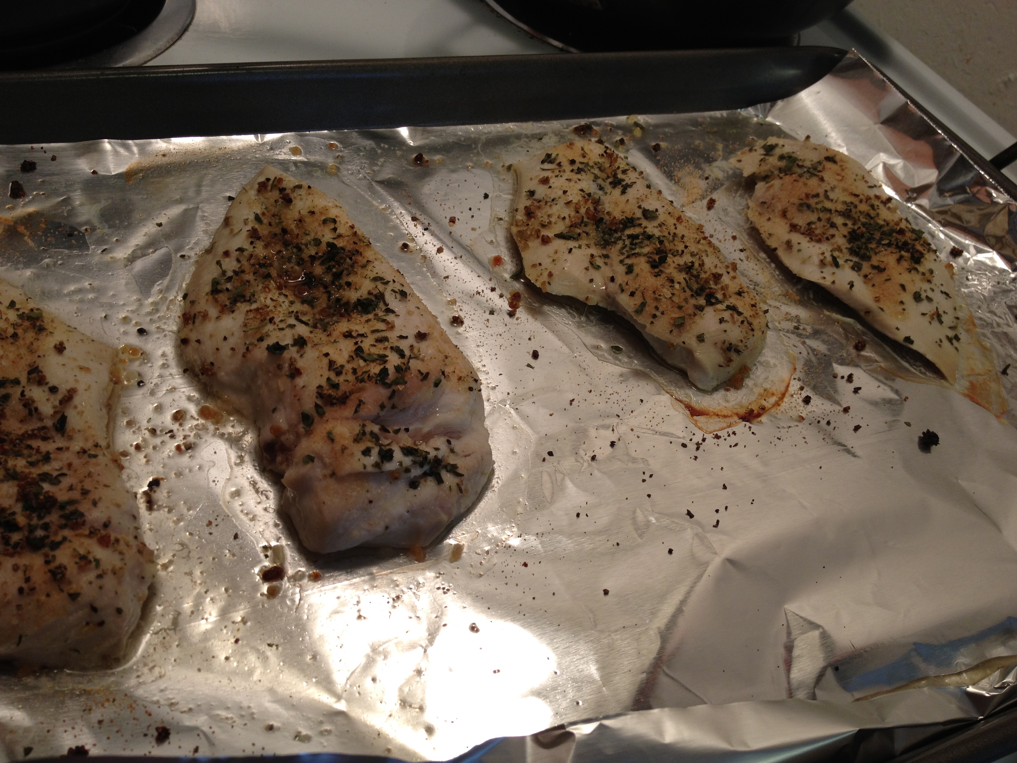 After cleaning a few thin chicken breasts I sprayed them lightly with olive oil and sprinkled oregano, garlic and other seasoning on top.