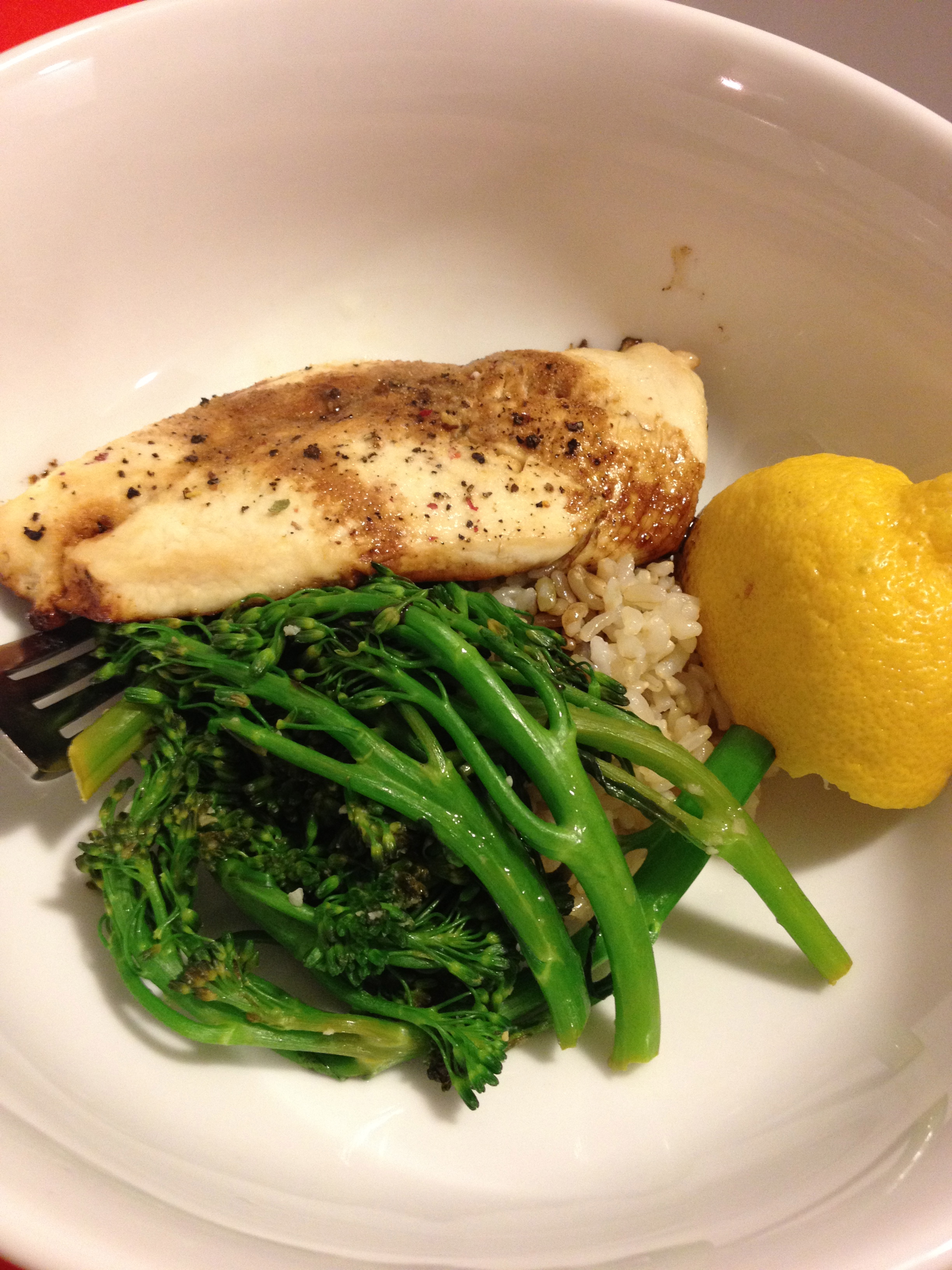 Chicken and broccolini cooked in balsamic vinegar and lemon with some brown rice.