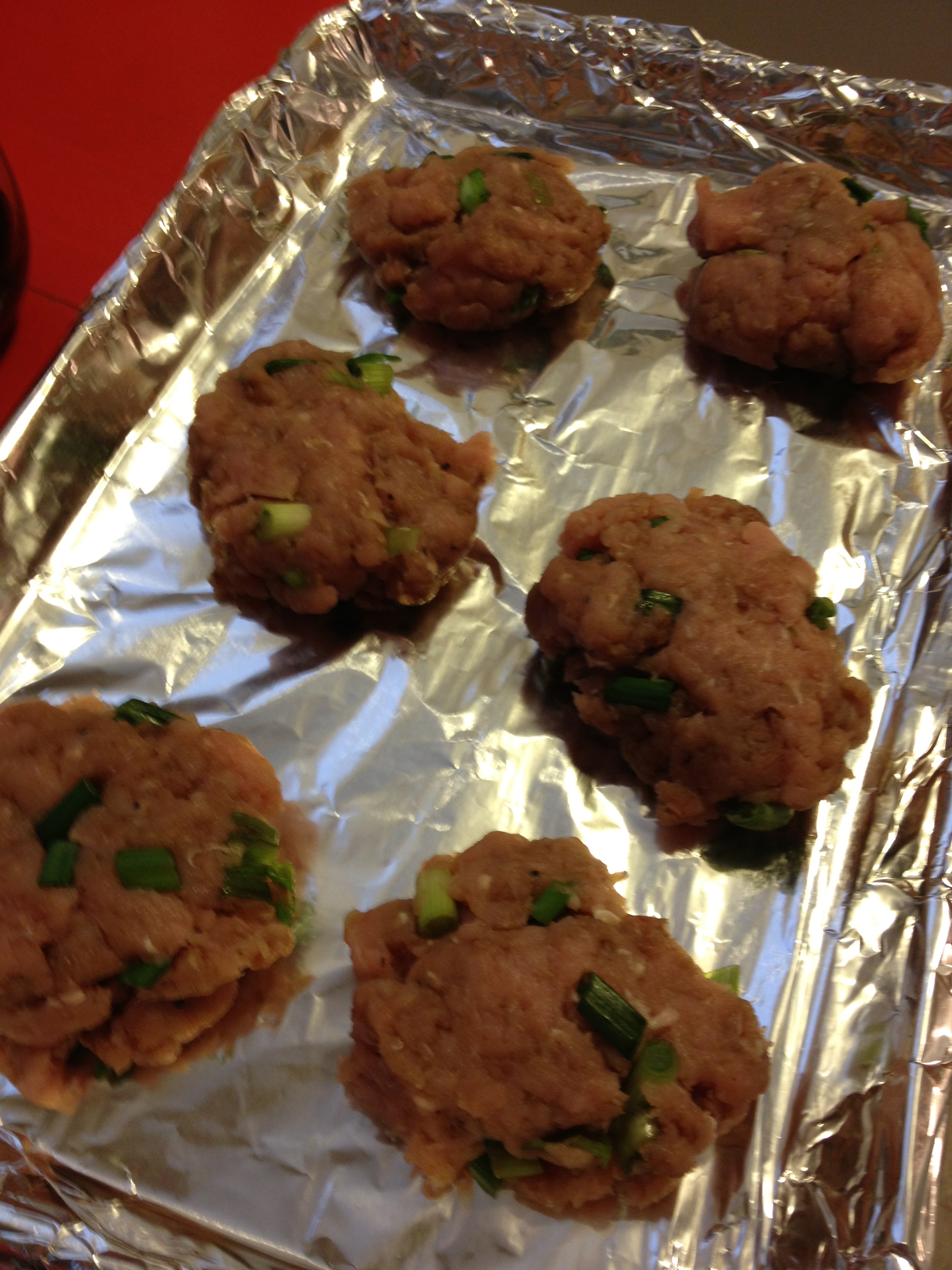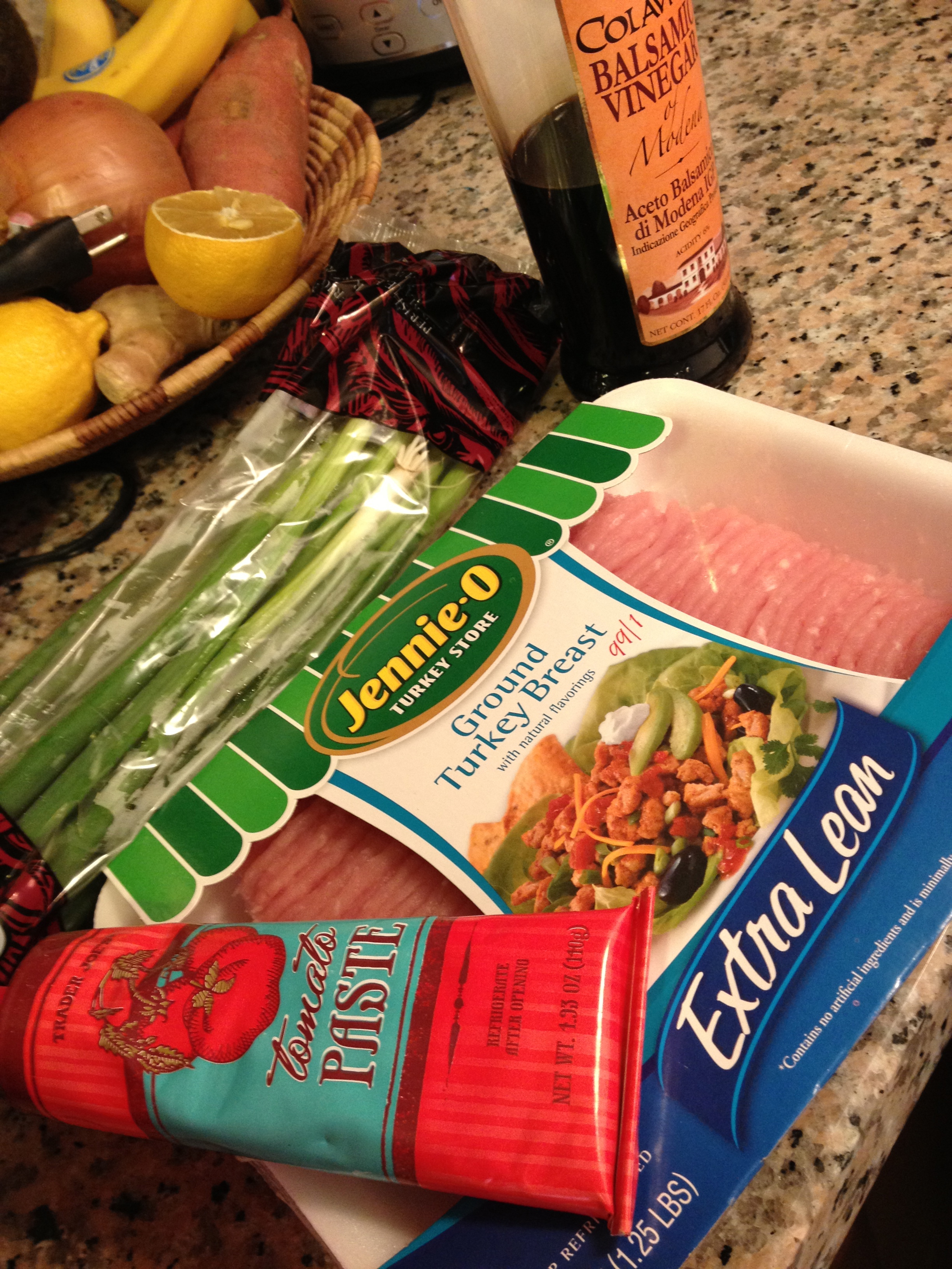 Extra lean meat, green onions, balsamic vinegar, garlic powder and a tablespoon of tomato paste. Mix together and bake for 20 minutes in a 400 degree oven.