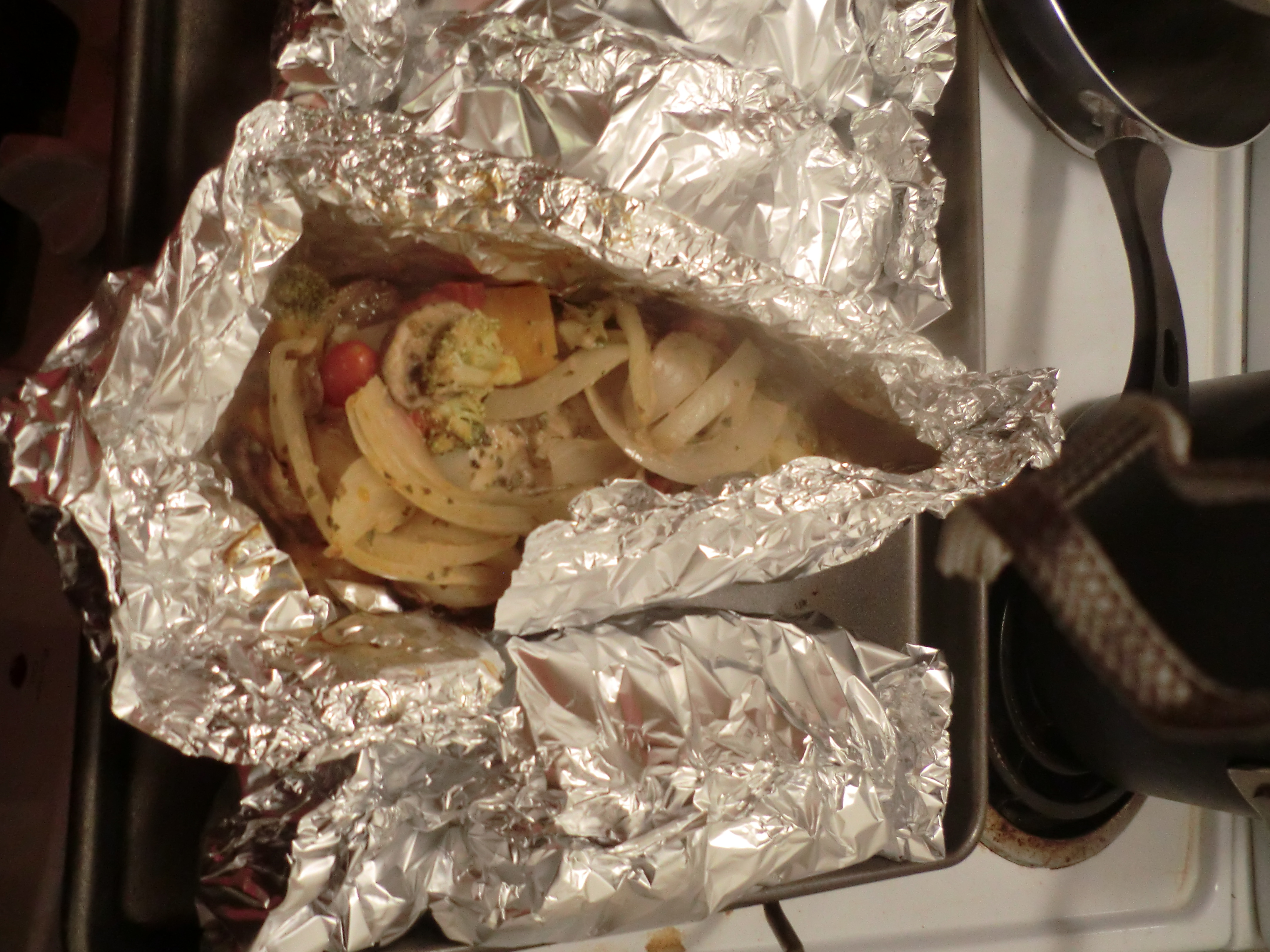 Place foil packs in the over for 30-45 minutes (depending on the size of the chicken breasts)